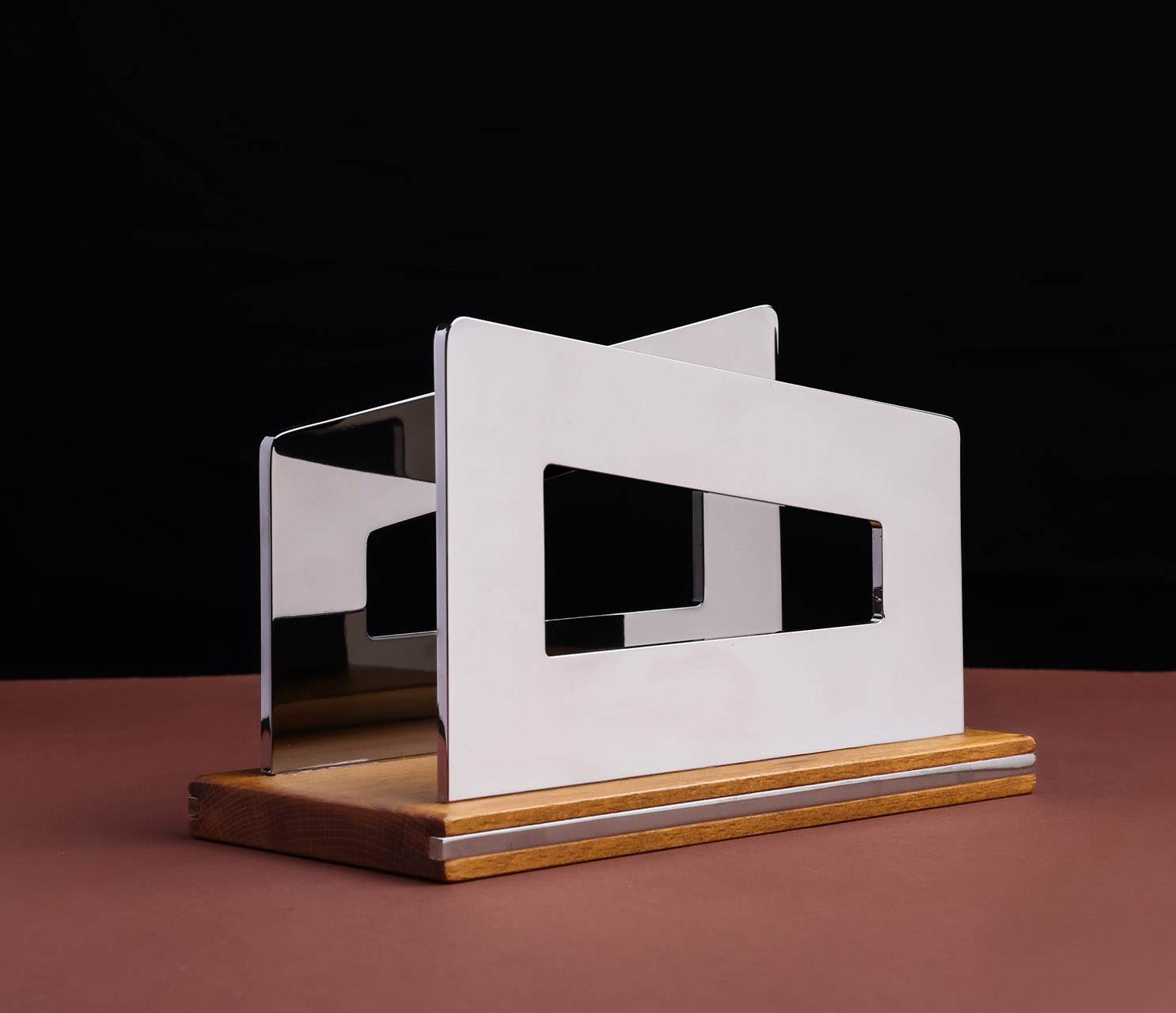 Un oggetto che si distingue per cura dei dettagli, materiali nobili e lavorazione artigianale. Questo porta tovaglioli è una piccola architettura in equilibrio tra pieni e vuoti, realizzata attraverso l’incontro tra lamine in alluminio galvanizzato color titanio e basi in legno di faggio ottenuto dal riciclo di scarti di lavorazione, rifinite in tonalità noce. Ogni pezzo viene lavorato con macchinari CNC di ultima generazione per garantire una precisione assoluta e successivamente rifinito a mano dai nostri artigiani per conferire unicità e tattilità. Il risultato è un accessorio elegante, dal design sobrio ma ricercato, capace di arricchire la tavola e di inserirsi con armonia in qualsiasi stile di arredamento. È il dettaglio che fa la differenza: un elemento decorativo funzionale, pensato per chi vede nell’home decor un’estensione del proprio gusto personale. Come tutti i prodotti della linea, anche il porta tovaglioli è configurabile su richiesta, per rispondere ad esigenze estetiche specifiche.