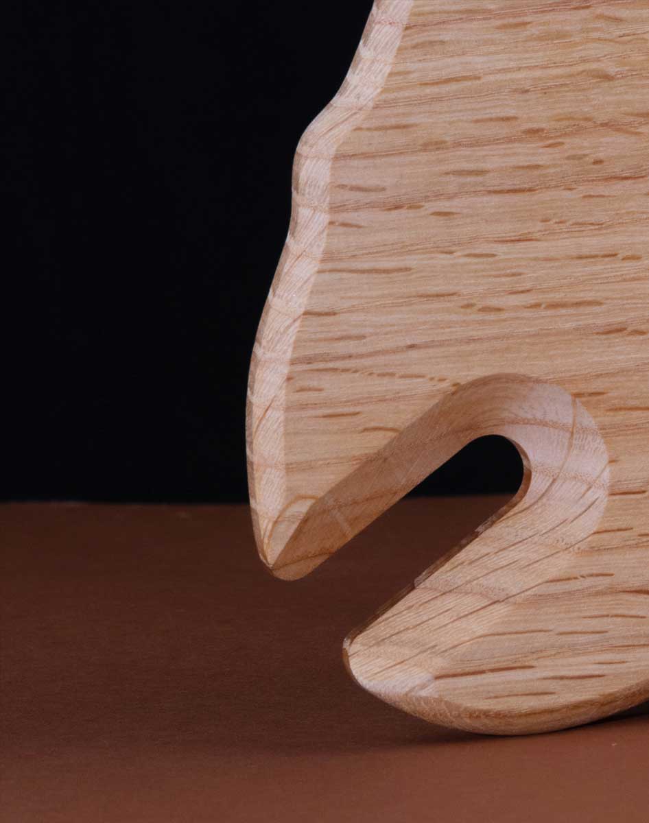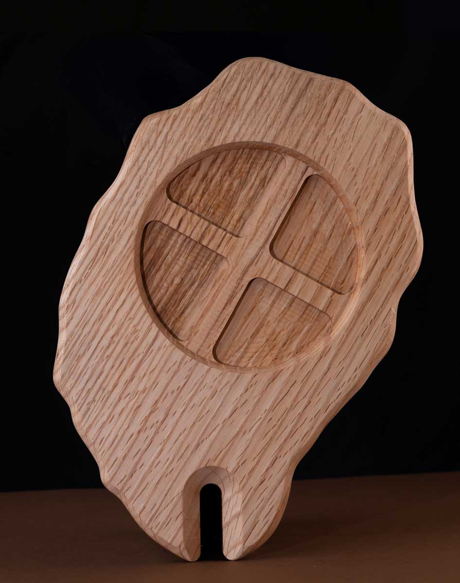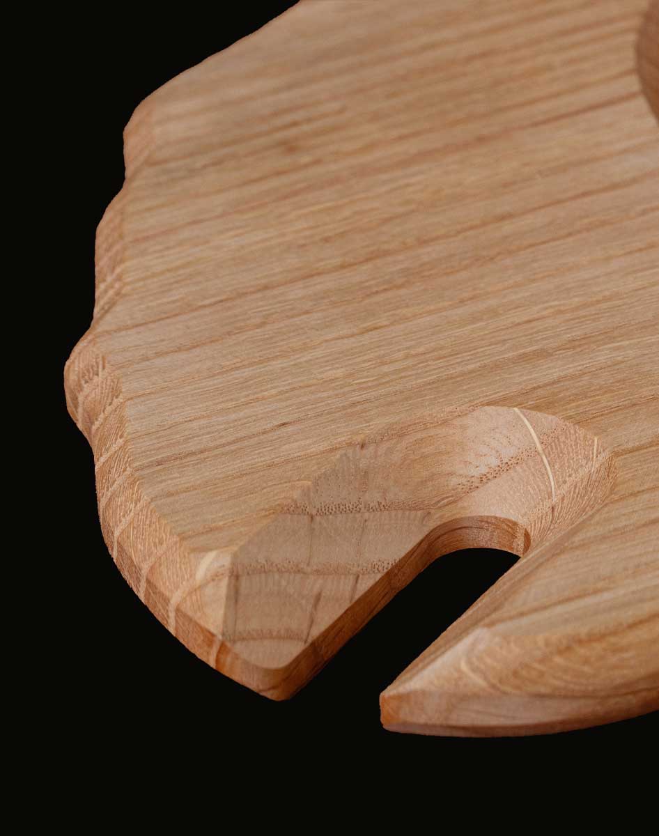 Il blocco di legno viene fresato a macchina CNC e carteggiato a mano. Sul piano del vassoio è stato realizzato un foro che, oltre ad alleggerire la struttura, permette di accogliere i piatti e renderli stabili. La finitura finale dell’oggetto prevede l’applicazione di un olio che ne esalti i colori e le venature.